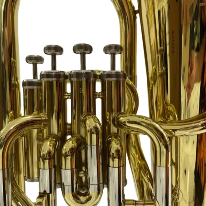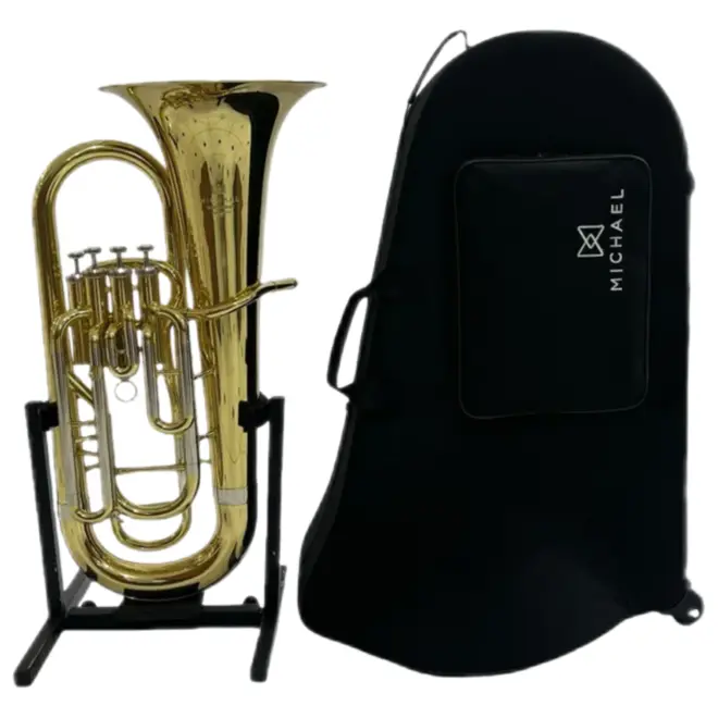 O Euphonium em Bb Laqueado 4 Pistos da marca Michael é um instrumento de alta qualidade, ideal para músicos de orquestra e bandas de música. Se destaca pelos tubos de encaixe em alpaca/cuproníquel, material durável, e pelas válvulas em aço inoxidável, garantindo excelente digitação. O timbre robusto, aveludado e suave do instrumento o torna uma escolha excepcional. O acabamento laqueado proporciona um visual elegante, complementado pelos botões de digitações perolados, que conferem um charme especial ao Euphonium.